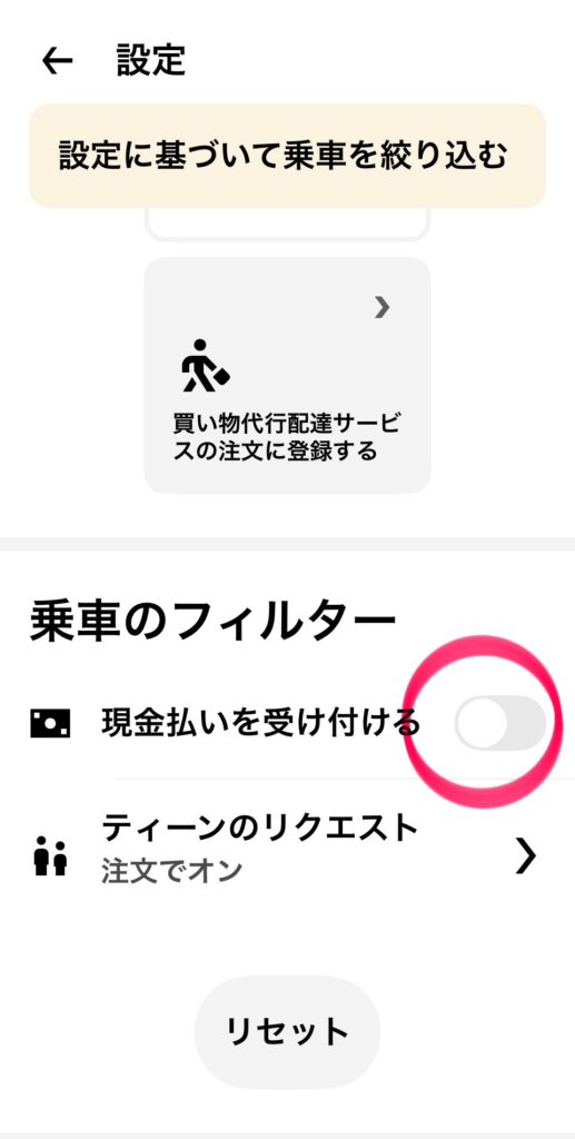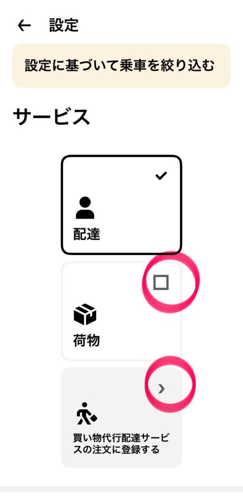 - 荷物 買い物代行配達サービス:こちらも「オフ」で大丈夫です。